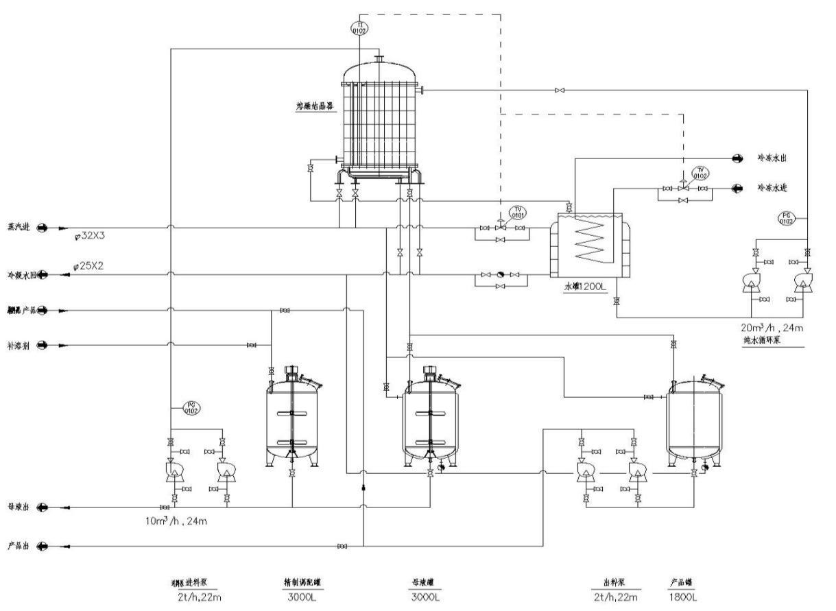 若不帶殘?jiān)礈旆蛛x系統(tǒng), 若加的料是較純的,這樣將損失產(chǎn)品, 因此需分離殘?jiān)? 以提高收率。過程產(chǎn)生的廢蒸汽相應(yīng)可濃縮雜質(zhì), 實(shí)際上, 每批加工收集到的殘?jiān)e存到可裝滿結(jié)晶器時再加工, 可以用多級洗滌分離進(jìn)一步減少殘?jiān)俊T诙嗉墯堅(jiān)?共熔點(diǎn)組分都是相近的, 所以可一起回收。