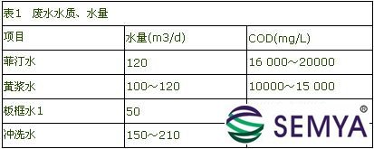 生產廢水主要來源于浸泡、胚芽分離、纖維洗滌和脫水等工序,其主要成分為淀粉、糖類、蛋白質、纖維素等有機物質和氮、磷等無機物,各種廢水水質、水量見表1。