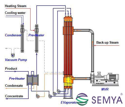 蒸汽機(jī)械再壓縮蒸發(fā)器簡(jiǎn)稱(chēng)MVR蒸發(fā)器,相較于傳統(tǒng)的多效蒸發(fā),是一種高效、節(jié)能的技術(shù)。MVR蒸發(fā)器是指機(jī)械式熱能壓縮蒸發(fā)器,是國(guó)際上二十世紀(jì)九十年代末開(kāi)發(fā)出來(lái)的新型高效蒸發(fā)設(shè)備。其工作原理是蒸發(fā)器產(chǎn)生的二次蒸汽經(jīng)機(jī)械式熱能壓縮機(jī)(類(lèi)似于鼓風(fēng)機(jī))作用后,溫度提升5~8℃,返回用于蒸發(fā)器的加熱熱源,新鮮蒸汽僅用于補(bǔ)充熱損失和補(bǔ)充進(jìn)出料熱焓,從而大幅度減低蒸發(fā)器對(duì)外來(lái)新鮮蒸汽的消耗。原來(lái)要廢棄的蒸汽就得到了充分的利用,回收了潛熱,又提高了熱效率,生蒸汽的經(jīng)濟(jì)性相當(dāng)于多效蒸發(fā)的30效,減少了對(duì)外部加熱及冷卻資源的需求,降低能耗,減少污染。